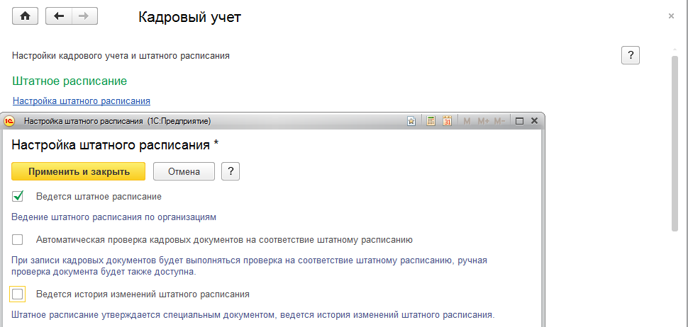 При этом настройки кадрового учета должны быть следующими (выполнены в начальной базе).