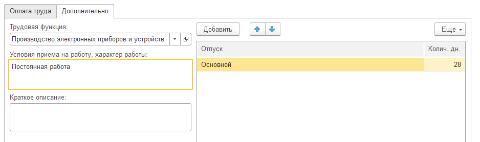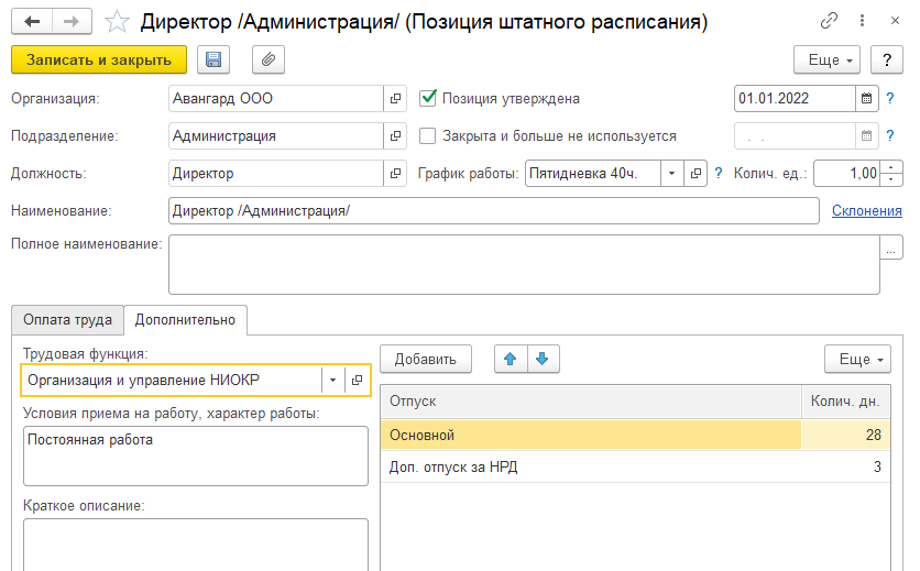 Условия приема на работу – Постоянная работа, описание – Руководство предприятием, право на основной отпуск 28 дней, доп. отпуск за ненормированный рабочий день 3 дня. Позицию следует записать и закрыть.