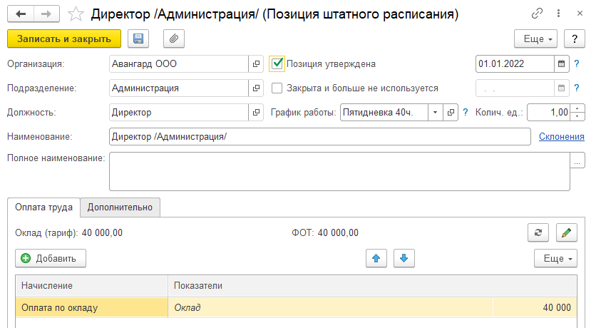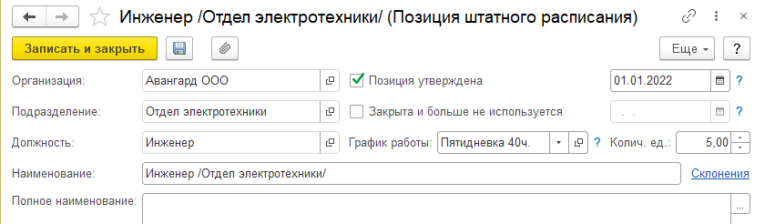 Рассмотрим данные позиции штатного расписания подробнее. При добавлении новой позиции штатного расписания указывается: