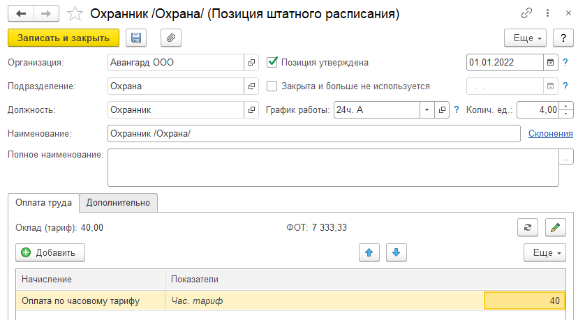 Подразделение – Охрана, Должность – Охранник; Позиция утверждена 01.01.2022, График работы сменный – 24ч. А, 4 ставки; оплата по часовому тарифу 40руб./час.
