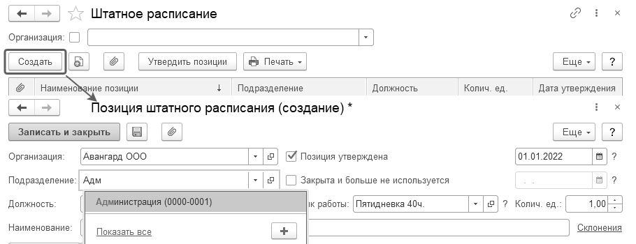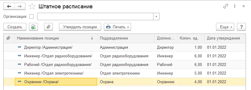 Дополним штатное расписание ООО "Авангард" и введем несколько позиций на 01.01.2022 непосредственно в справочнике "Штатное расписание" по команде "Создать".