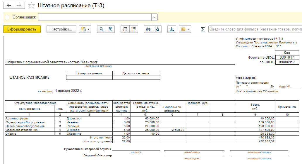 Таким образом, штатное расписание для ООО "Авангард" составлено.