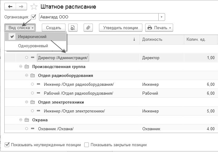 Кроме того, список штатных единиц может быть одноуровневым либо многоуровневым, пользователь может указать данную настройку самостоятельно, в зависимости от того, какое отображение ему более удобно. Как правило, иерархический список просматривается, если установлен отбор по организации.