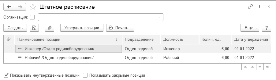 При этом в списке позиций штатного расписания можно будет отображать как закрытые позиции, так и еще не утвержденные. Неутвержденные позиции отмечаются жирным шрифтом, закрытые – зачеркнутым.