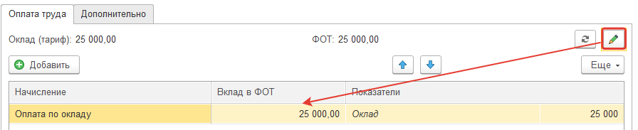 На закладке "Оплата" заполняем ФОТ по позиции: начисление "Оплата по окладу" выбирается из списка начислений. Размер начисления (месячная тарифная ставка) указывается вручную, в нашем примере она равна 40 000 руб.