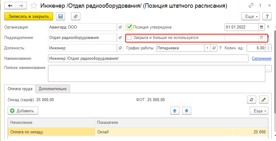 В последующем для закрытия позиции можно указать флаг "Закрыта и больше не используется" и дату исключения позиции из штатного расписания. Обратите внимание, что в таком случае для подразделения и должности отдельно устанавливается дата расформирования в их карточках, если они окончательно исключены из кадровых данных и более не будут использоваться.