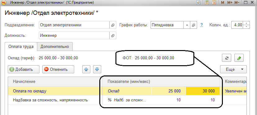 В крупных компаниях при составлении штатного расписанию зачастую используется "вилка" окладов. Например, при приеме на работу сотрудников на определенную должность всем гарантирована минимальная ставка по должности, но с учетом коэффициентов за стаж работы, наличие нескольких образований и тому подобных характеристик, минимальный размер может быть больше. Если данная ситуация нормативно обоснована, то в программе можно включить такую возможность в настройках кадрового учета программы.