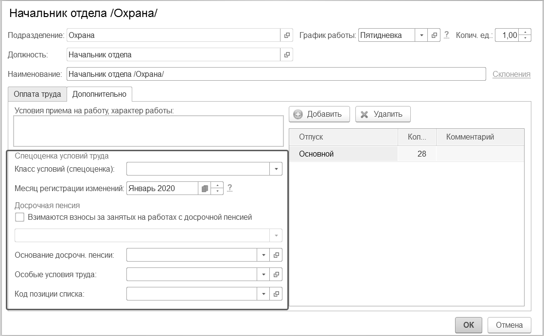 Если в настройках учетной политики организации указано применение особенностей при расчете страховых взносов, то уточнения льготных кодов, данных о спецоценке и пр. можно производить не только для должности, но и для позиции штатного расписания. Данные заполняются по данным должности автоматически, и могут быть скорректированы.