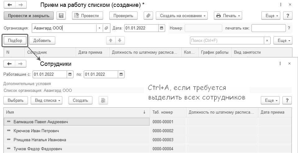 Затем создается документ "Прием на работу списком", в который подбираются не принятые еще сотрудники.
