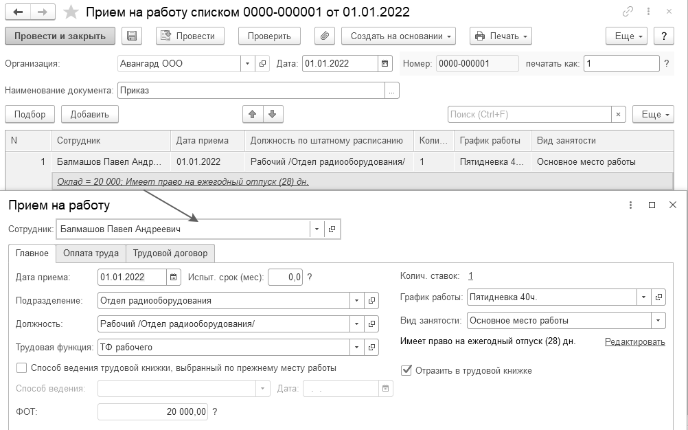 · У каждого вида документа в программе своя собственная нумерация, поэтому документ прием на работу списком в учебной базе так же имеет первый номер;