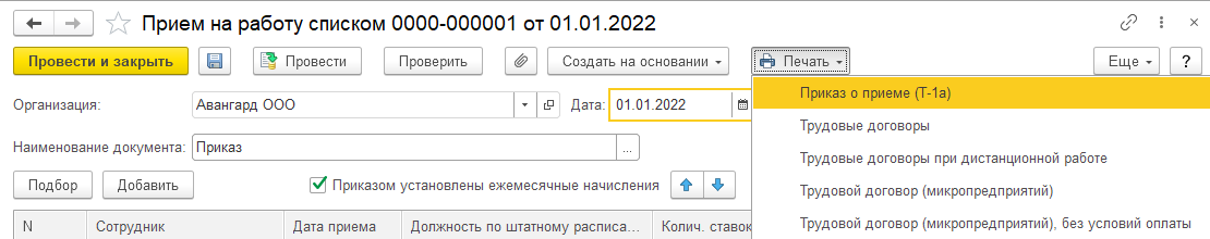· Из формы документа можно вывести на печать приказ по форме Т-1а.