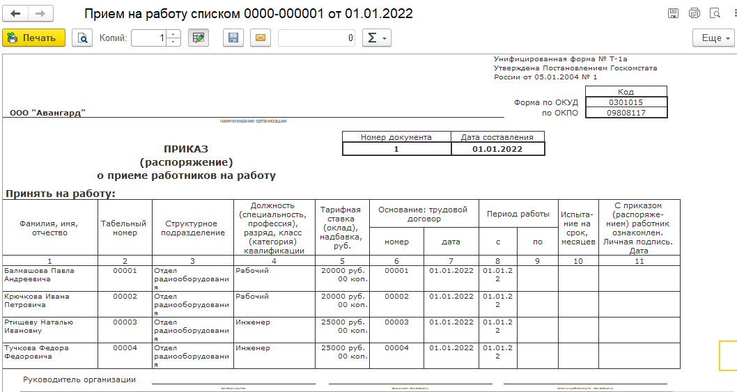 В учебной базе уже создан данный документ и приняты на работу 4 сотрудника.