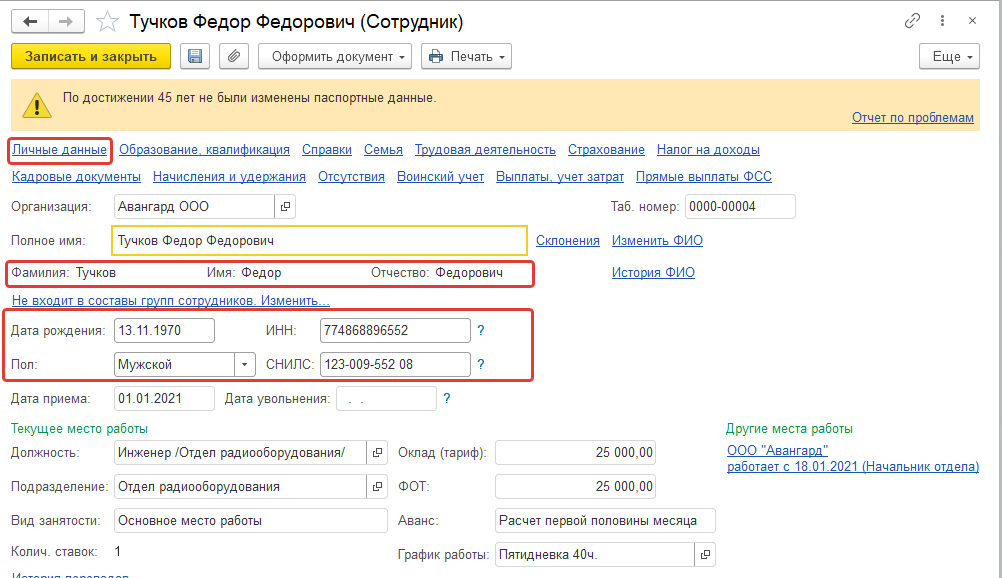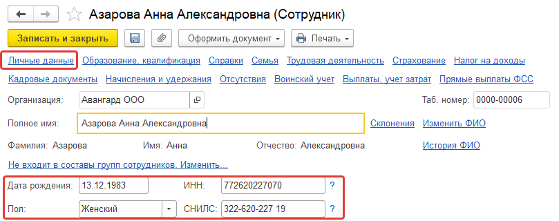 Введем общие личные данные для сотрудников, которых не было в базе. Для этого поочередно откроем карточки сотрудников, проверим уже имеющуюся информацию и корректность ее ввода.