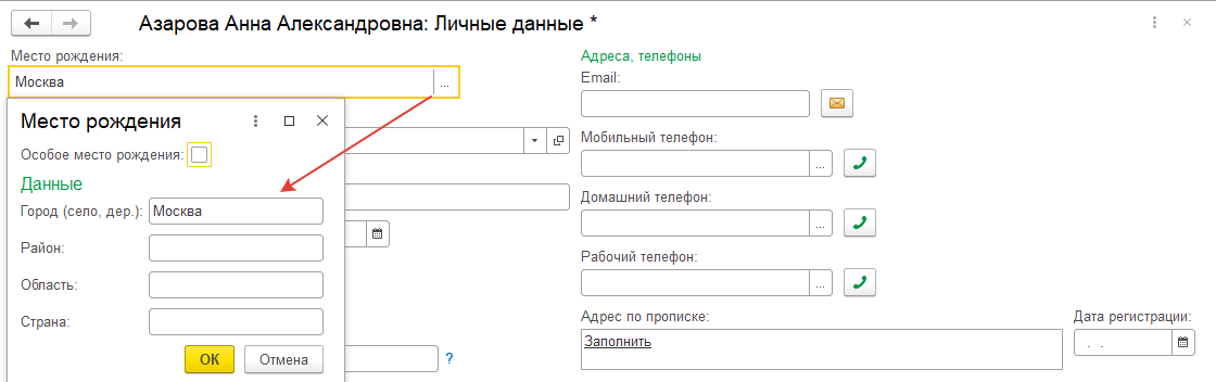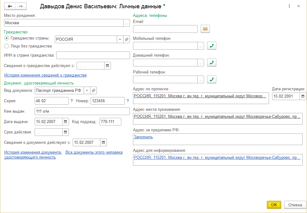 При сохранении адреса по прописке он автоматически скопируется для других видов адреса (если копирования не произошло, то правым кликом мыши на адресе проживания вызываем контекстное меню и выбираем команду – Заполнить и указываем адрес прописки). Сохраним основные личные данные по команде ОК.