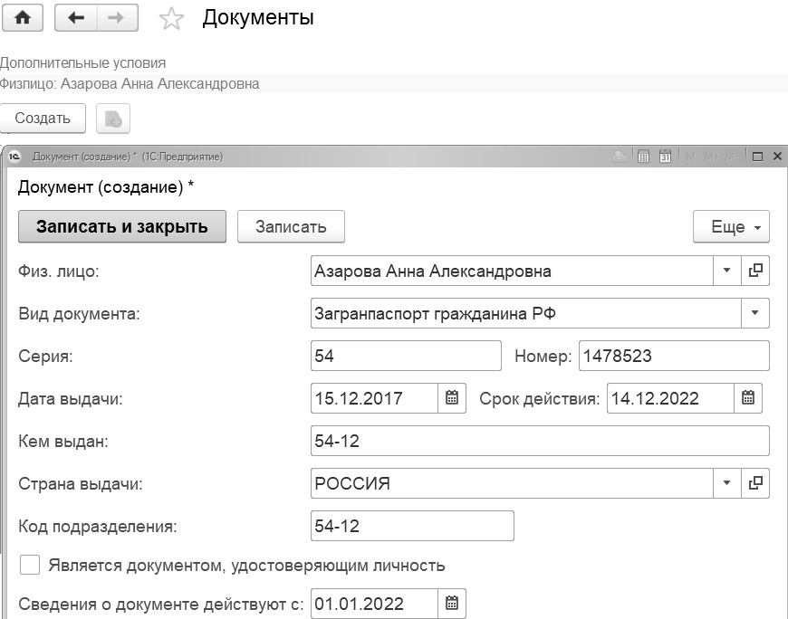 Внесем сведения о заграничном паспорте, предоставленном Азаровой А.А.: загранпаспорт гр-на РФ, серия 54 номер 1478523, дата выдачи 15.12.2017, срок действия 14.12.2022, кем выдан 54-12, запись действует с 01.01.2022. Сохранение этого документа производится по отдельной команде "Записать и закрыть".