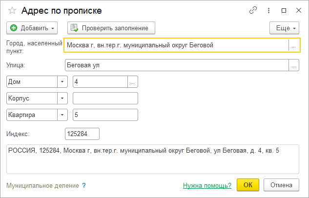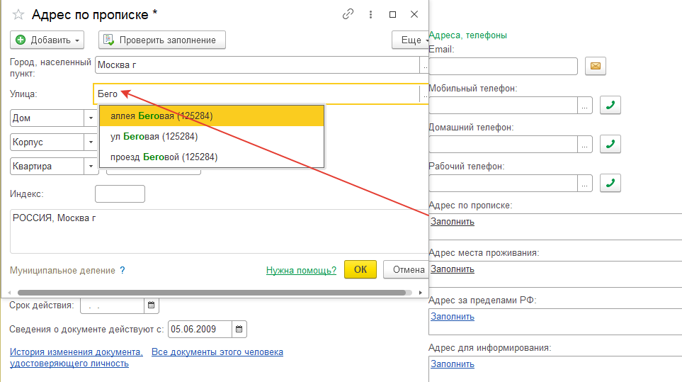 1.3. Контактные телефоны сотрудник не сообщил, заполним адрес регистрации (т.е. адрес по прописке). Ввод адреса осуществляется подбором по адресному классификатору (как заполнялся адрес для организации). Адрес: г. Москва, ул. Беговая, д.4 кв.5, индекс 125284 (получим автоматически). Также можно проверить адрес на соответствие адресному классификатору. Дата регистрации 18.12.2003