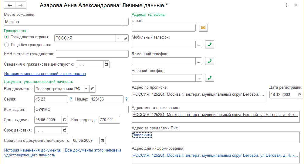 · Сведения о гражданстве – по умолчанию указывается, что человек является гражданином России, для иностранцев страна выбирается из классификатора стран мира и дата изменения сведений о гражданстве;