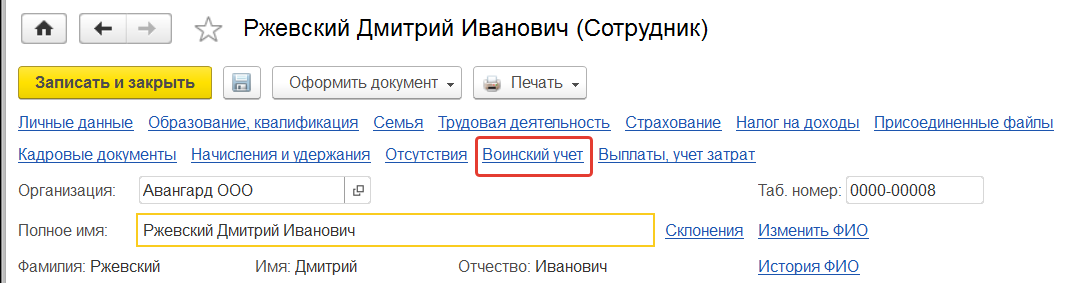 Данные военного билета для военнообязанных сотрудников вносятся по ссылке "