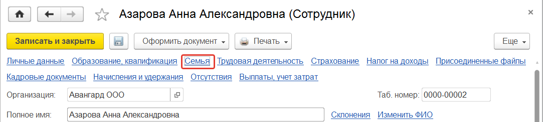 В карточке сотрудницы Азаровой А.А. перейдем по ссылке "Семья" и внесем сведения о состоянии в браке и родственниках.