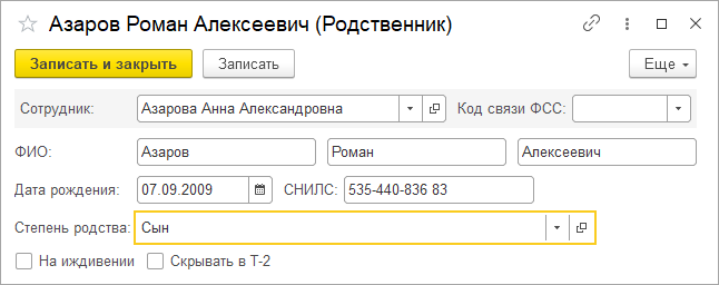 Выбор вида семейного положения и степеней родства осуществляется из кадровых справочников-классификаторов. Сведения о родственниках могут использоваться при заполнении больничных листов (например, по уходу за ребенком). Признак "На иждивении" может использоваться при расчете выплат военнослужащим на иждивенцев. Признак "Скрывать в Т-2" позволяет вносить в списки любых интересующих организацию родственников, и при этом не выводить ненужную информацию в личную карточку Т-2 при печати.