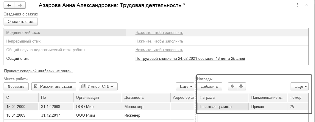 Трудовая деятельность". Раздел "Награды" заполняется сведения о полученных наградах и поощрениях.