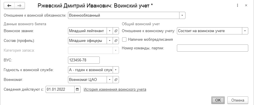 Эти сведения будут также использоваться в отчетности по воинскому учету. Сведения о воинском учете являются периодическими, т.е. могут изменяться во времени. Изменения в данные воинского учета вносятся по аналогии с изменениями паспортных данных.