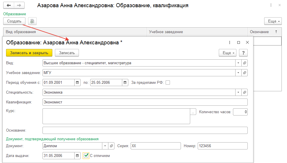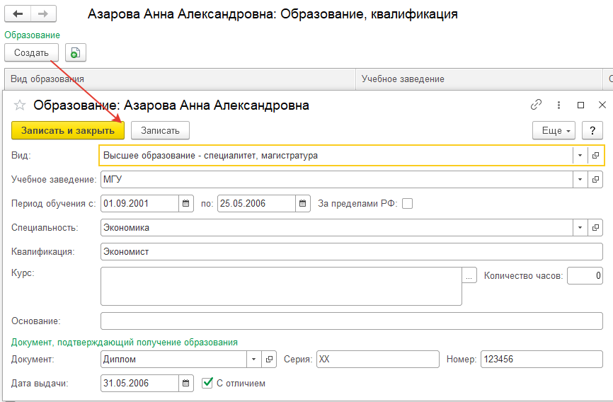 Внесем сведения об образовании для Азаровой А.А. Для этого в карточке данной сотрудницы перейдем по ссылке "Образование, квалификация" и нажмем команду "Создать". Заполним сведения о высшем образовании: