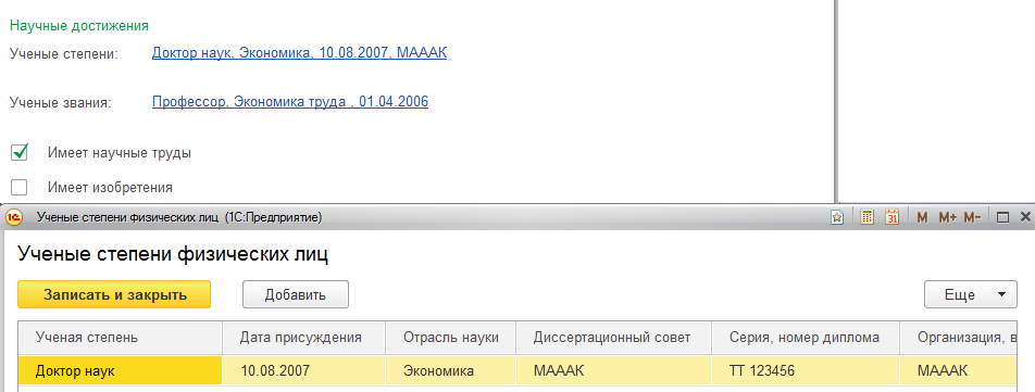 - Сведения об ученых степенях и званиях, а также о наличии научных трудов и изобретений.