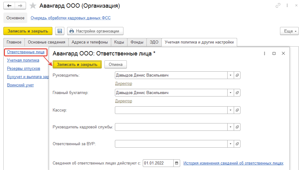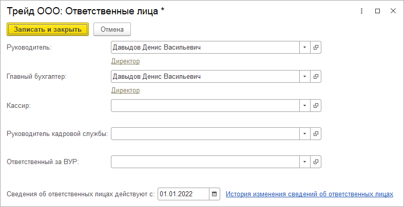 Аналогичным образом настроим ответственных лиц на 01.01.2022 для ООО "Трейд".