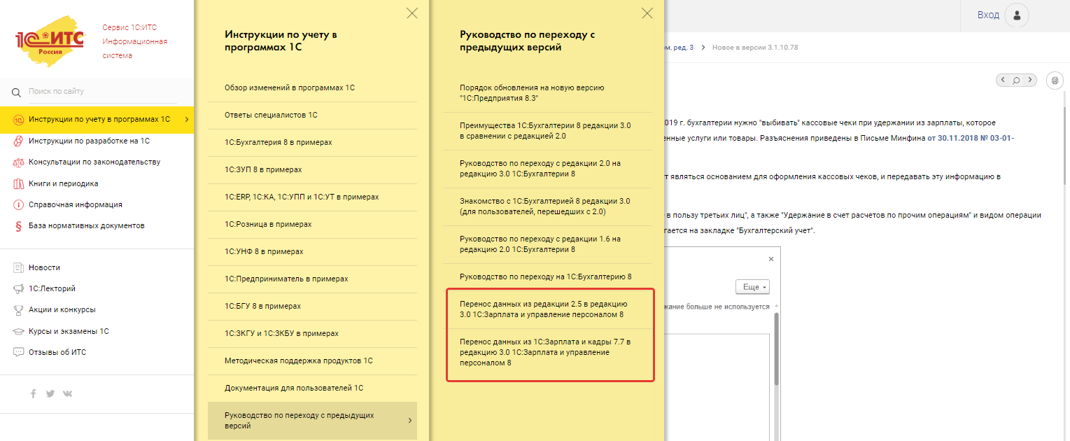 Также в разделе " Инструкции по учету в программах 1С" можно получить доступ к документации по программе и руководству по переходу с предыдущих версий.