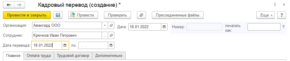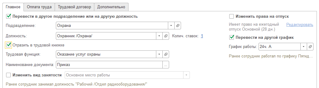 Документ, как и прием на работу (который мы рассматривали ранее), имеет следующие особенности, если они предусмотрены настройками программы: