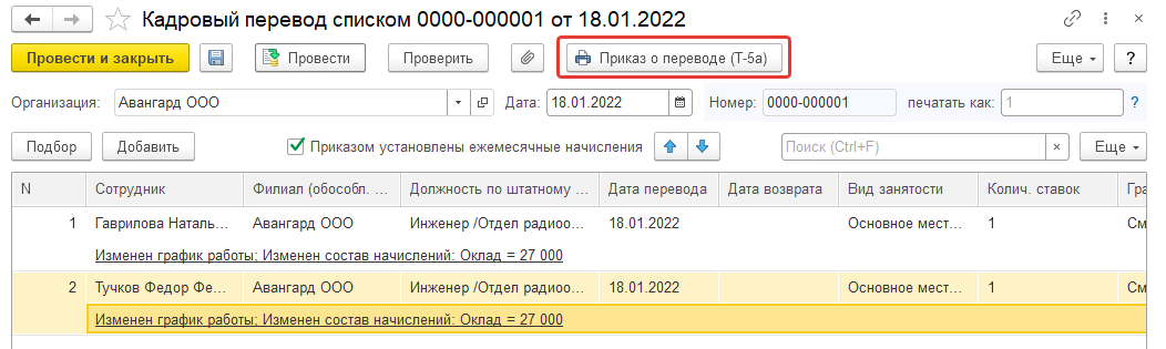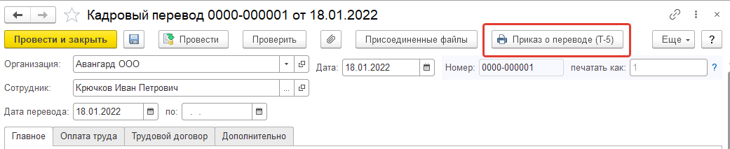 Документ должен быть проведен. Из формы документа "Кадровый перевод" можно распечатать приказ о переводе сотрудника по форме Т-5, из формы документа "Кадровый перевод списком" – групповой приказ о переводе сотрудников по форме Т-5а.