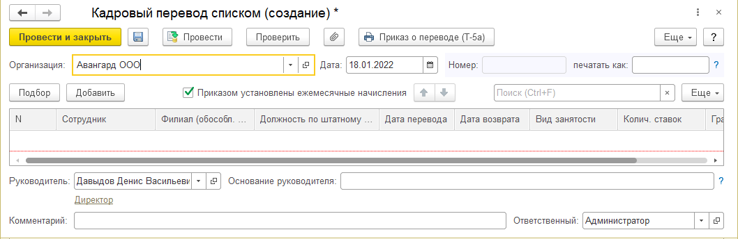 Документ "Кадровый перевод списком" позволяет ввести такие же данные для оформления перевода, но для списка сотрудников.