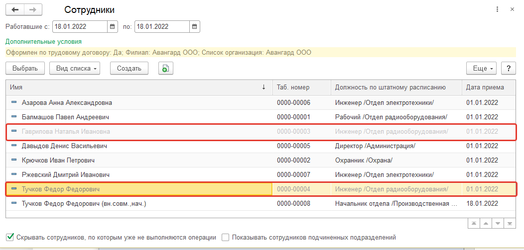 Подберем сотрудников – инженеров в отделе радиооборудования: Гаврилова Н.И. и Тучков Ф.Ф. (основной).