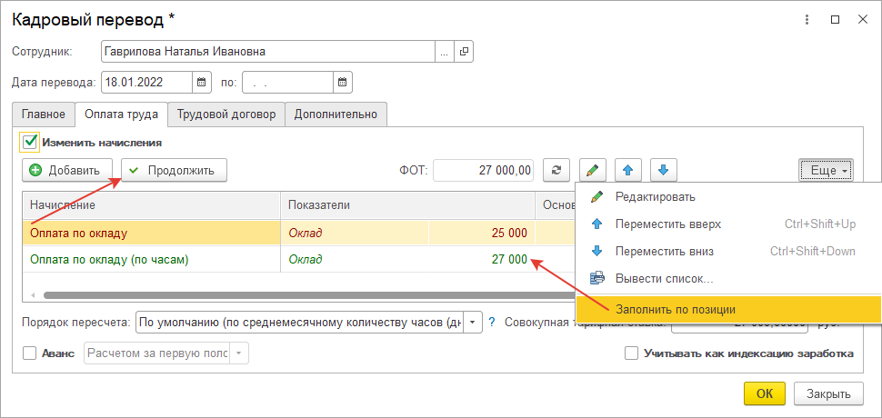 Перейдем на закладку "Оплата труда". Установим флаг "Изменить начисления". Заполним ФОТ по штатному расписанию. Оплату по окладу следует отменить (если она не будет отменена автоматически), ФОТ также при этом поменяется.