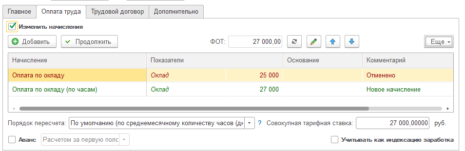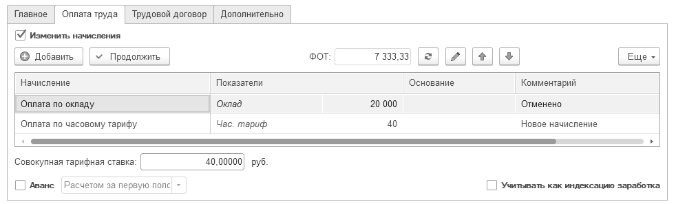 При этом здесь также возможно изменить порядок предоставления аванса, а также уточнить дополнительные тарифы, в случае использования в настройках программы нескольких тарифных ставок одному сотруднику (аналогично документу "Прием на работу").
