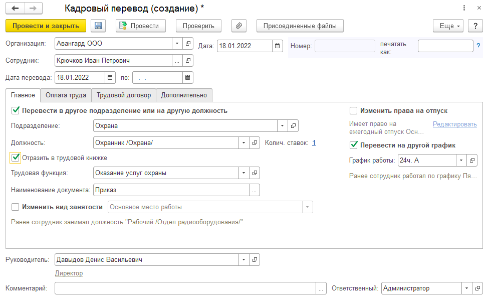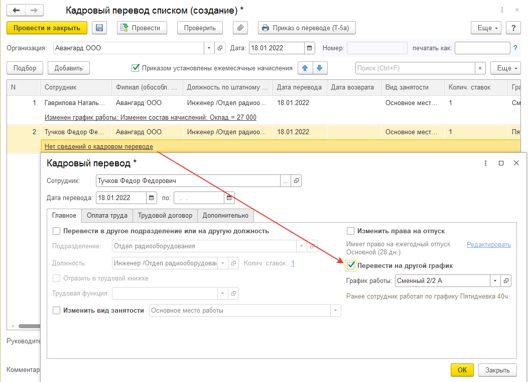 Укажем даты приказа и перевода: с 18.01.2022, новое подразделение и позицию штатного расписания. График работы сменный - 24ч. А, оплата труда по штатному расписанию.
