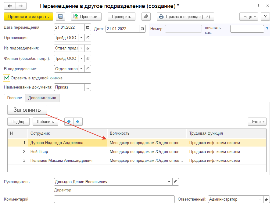 Документ можно заполнить автоматически по всем сотрудникам подразделения, из которого осуществляется перевод по команде "Заполнить" либо подобрать (добавить) сотрудников вручную. Здесь же уточняются позиции штатного расписания, которые будут занимать сотрудники. На вкладке "Дополнительно" вносятся текстовые сведения для печатных форм: причина и основание перевода, руководитель, подписавший документ. Также документ можно проверить на соответствие штатному расписанию.