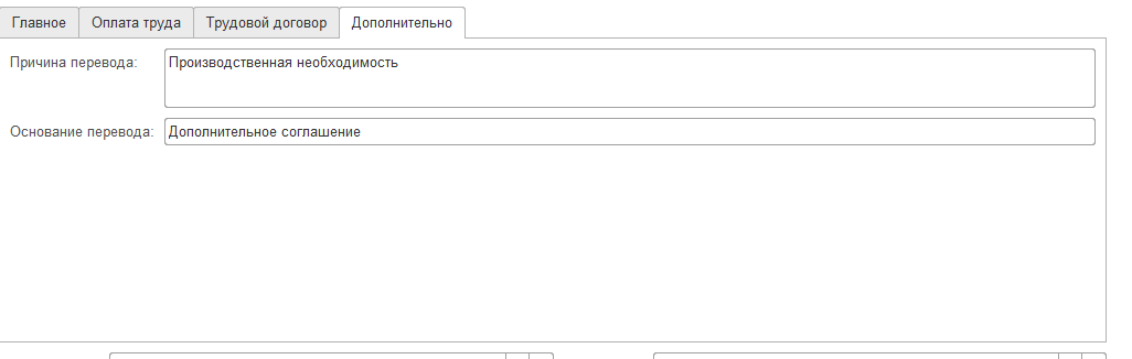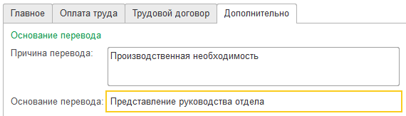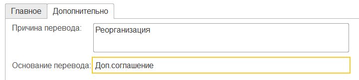 Дополнительно" можно указать сведения для печатных форм: основание и причину перевода.