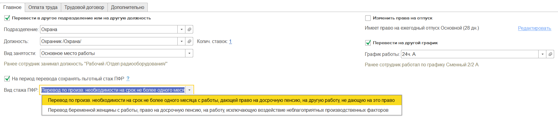При этом комментарии к документу будут подсказывать, какие ранее были сведения у сотрудника. Если на период временного перевода по производственной необходимости либо в связи с беременностью сотрудник будет переводиться с "вредной" должности, и при этом необходимо сохранить льготный стаж в ПФР, то следует установить соответствующий флажок и указать причину, по которой сохраняется стаж.
