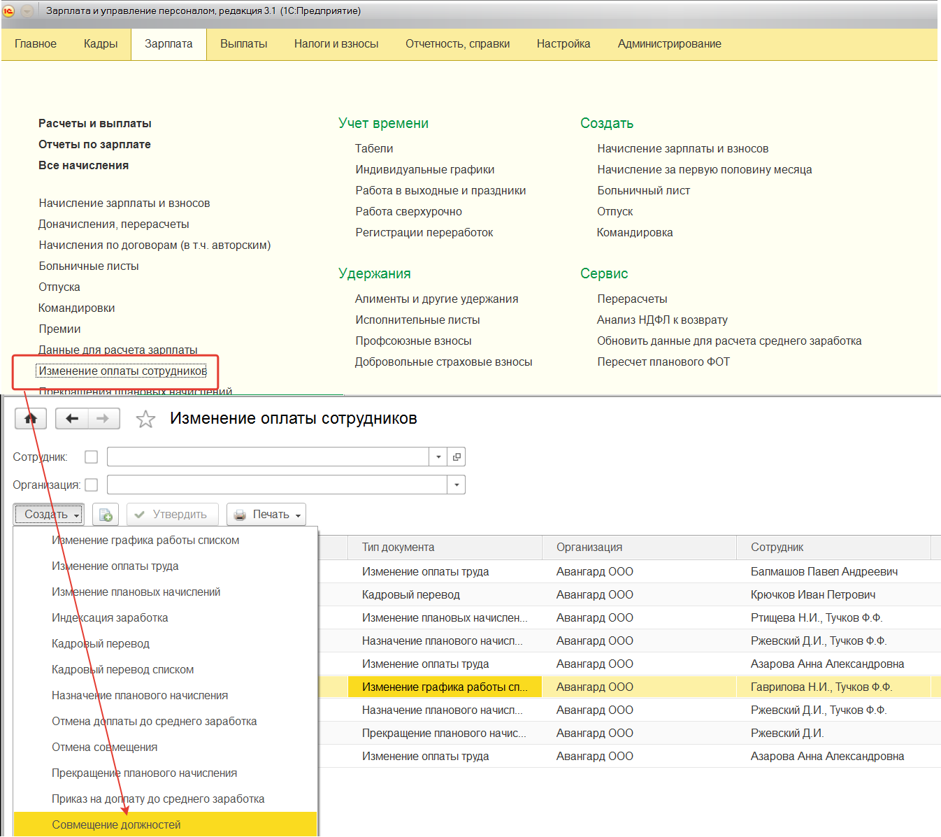 - Раздел "Зарплата / Изменение оплаты сотрудников".