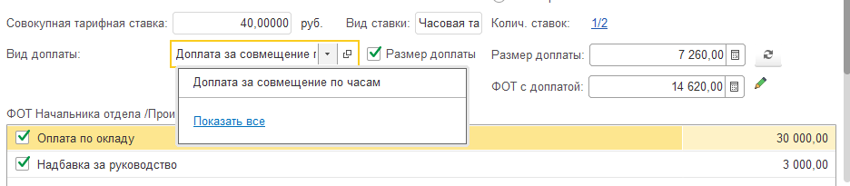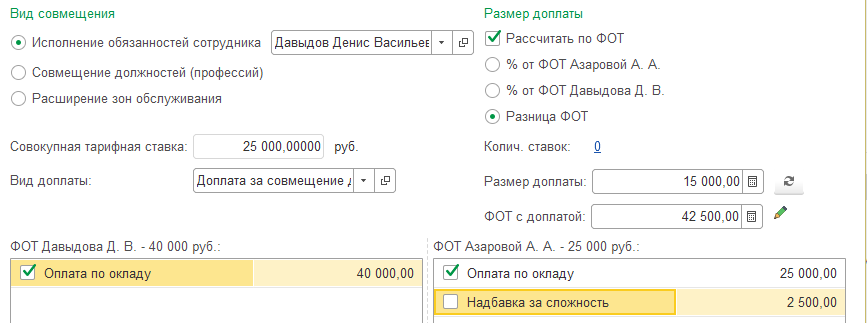 Вариант 1. Совмещение за конкретного сотрудника. В этом случае выбирается сотрудник, за которого работают, размер ежемесячной доплаты при этом можно как установить вручную, так и рассчитать процентом от ФОТ сотрудника либо отсутствующего сотрудника, либо разницей в ФОТ. Доплата устанавливается суммой (и рассчитывается за отработанное время).