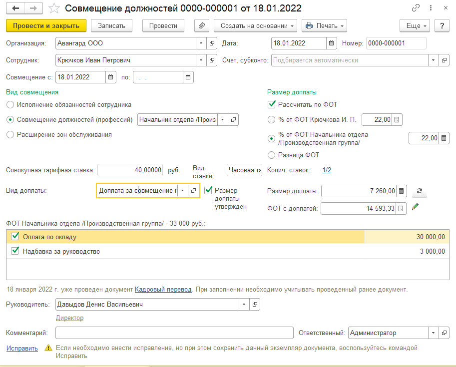 Крючкову И.П. с 18.01.2022 установили доплату за совмещение должности начальника производственной группы в размере 22% от ФОТ указанной позиции штатного расписания. Отразим данную ситуацию в программе.