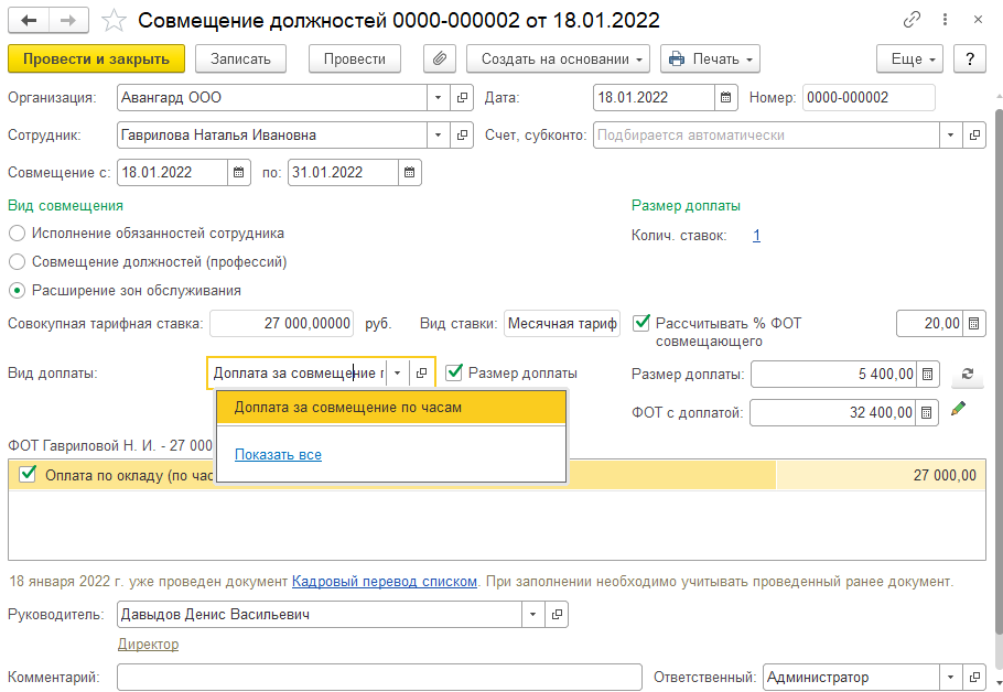 Гавриловой Н.И. с 18.01.2022 по 31.01.2022 назначена доплата за расширение зон обслуживания в размере 20% от ее ФОТ (5400 руб.). Отразим данную ситуацию в программе. Для этого в разделе "Зарплата/ Изменение оплаты сотрудников" создадим документ "Совмещение должностей", заполним данные о сотруднике и периоде назначения доплаты. Выберем вариант оплаты: расширение зон обслуживания, укажем размер доплаты вручную.