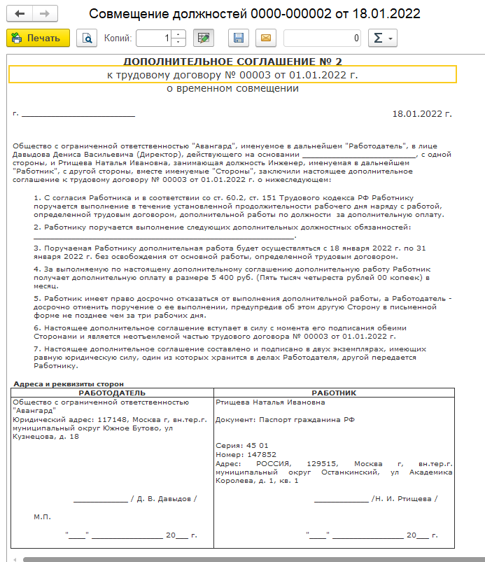 Проведем документ. Выведем на печать дополнительное соглашение и приказ на доплату за совмещение.