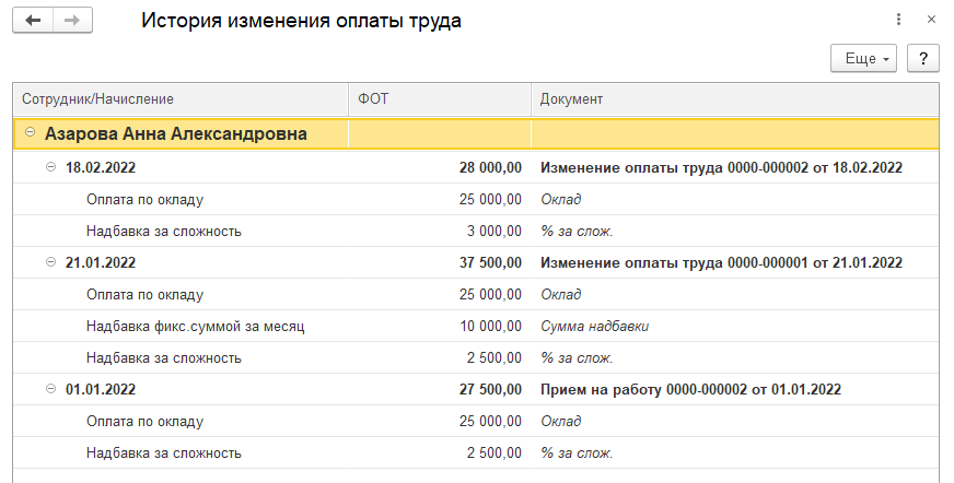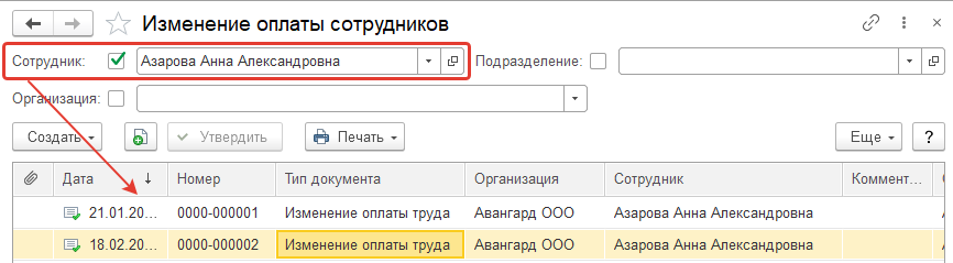 Способ № 2. В журнале документов по изменению оплаты труда ("Зарплата /Изменение оплаты сотрудников"). Здесь отражаются все документы, изменяющие постоянные начисления сотрудников, кроме приемов на работу (и отпусков по уходу за ребенком). Если создано несколько документов на изменение оклада на одну дату, будет действовать тот, который создан позднее по времени.