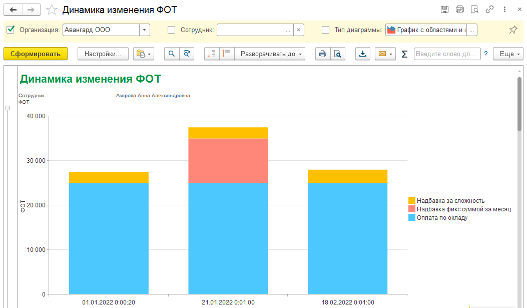 В отчете в виде диаграммы отражается динамика изменения ФОТ за заданный период.