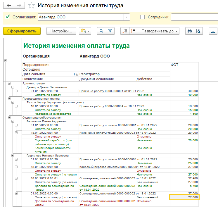 По отчету пользователь может отследить, как изменялись постоянные начисления сотрудников, заданные различными документами.