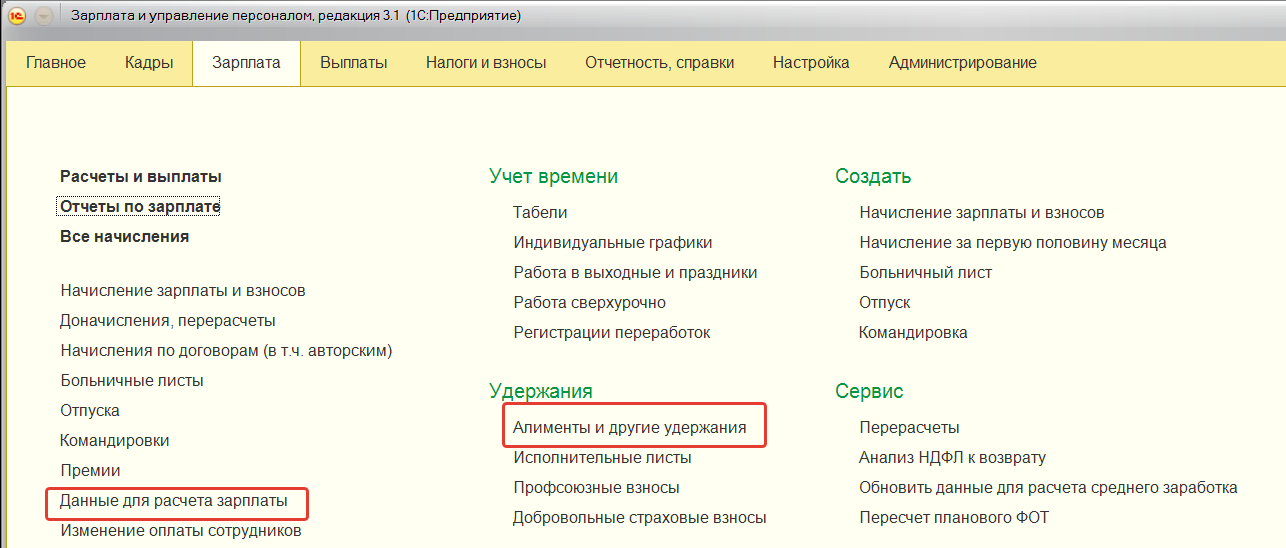 Напомним, что у видов расчета по удержаниям существует две настройки способа выполнения: ежемесячно или требует ввода показателя. Удержания с первой настройкой, а также специализированные удержания регистрируются документами из блока "Удержания" в разделе "Зарплата". Большая часть данных документов будет доступна только при соответствующих настройках расчета зарплаты программы и наличии удержаний со связанным назначением.