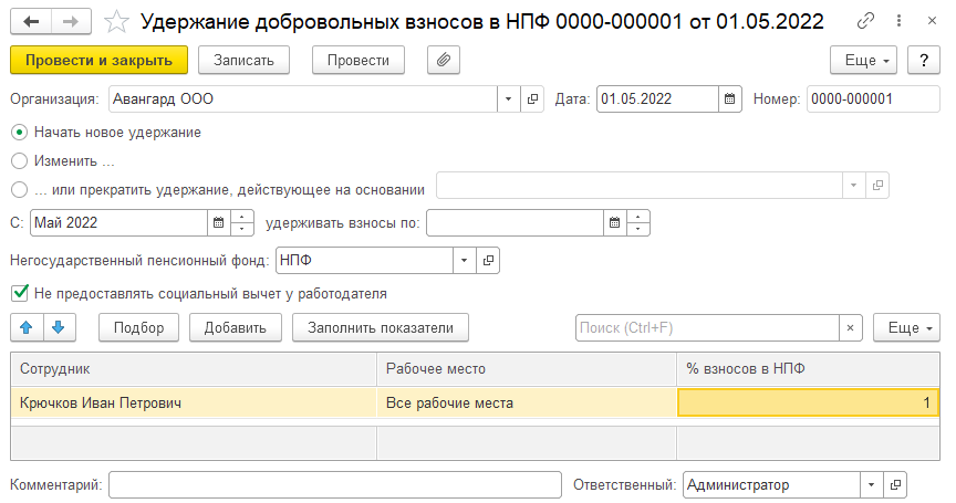 Введем удержание добровольных страховых взносов в НПФ в размере 1%. у сотрудника ООО "Авангард" Крючкова И.П. с 01.05.22. Для этого из раздела "Зарплата / Алименты и другие удержания" создадим документ "Удержание добровольных взносов в НПФ" и заполним его как на рисунке ниже.